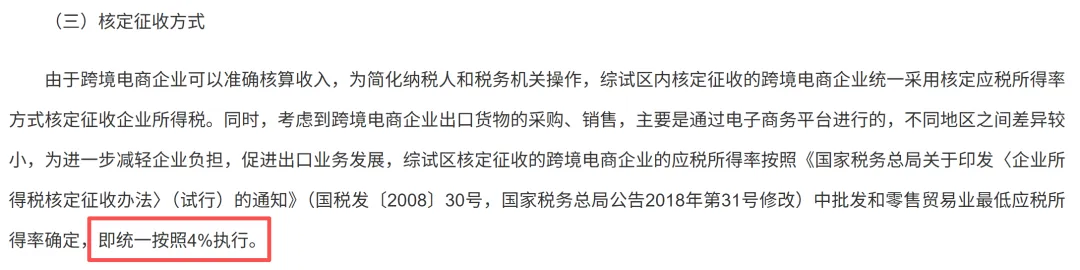 事实上,国家早已在跨境电商综试区推出针对电商主体的核定政策,根据国家税务局2019年第36号公告,综试区内的跨境电商企业,无票进货可享受增值税、消费税免税,同时企业所得税按 4% 应税所得率核定征收。
