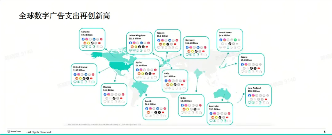 答案,藏在市场本身的结构化变革中。Sensor Tower基于海量数据洞察发现,2025年的欧美市场不再是“广撒网”就能见效的阶段:社交媒体仍稳坐流量主位,但OTT广告以21%的增速成为新黑马;短视频、零售媒体强势崛起,AI与本土制造成创意核心;而品类定渠道、旺季精细化投放,正成为头部品牌的增长关键。
