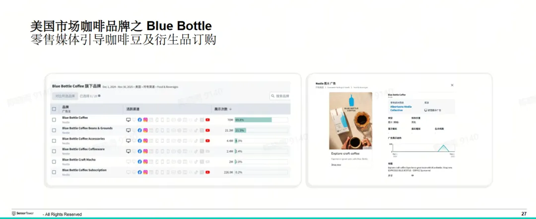 另外,被雀巢收购的Blue Bottle也值得关注:它仍保持品牌质感,但已开始布局快销路径,30%的广告花费用于推广咖啡豆、咖啡器具等产品,通过超市零售媒体实现“品牌到销售”的链路转化。