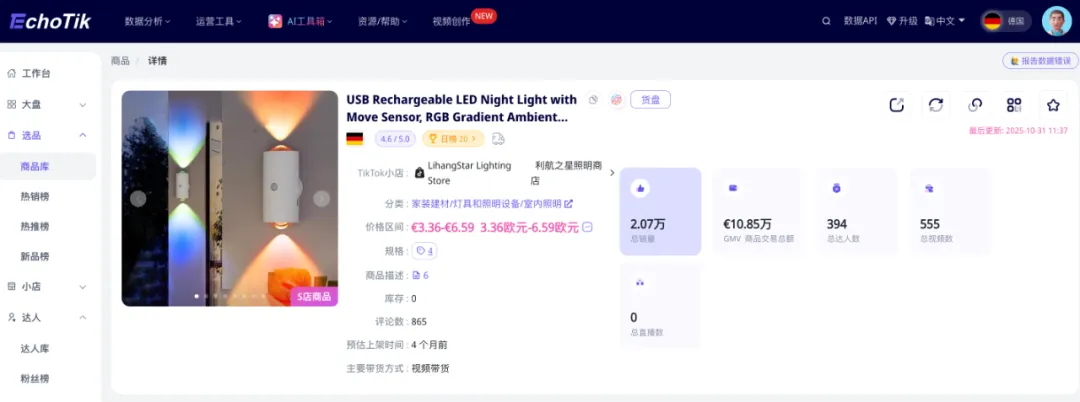 这款爆品出自一家名叫LihangStar Lighting Store的德国TikTok跨境灯具店,4个月总销量达到2.17万件!