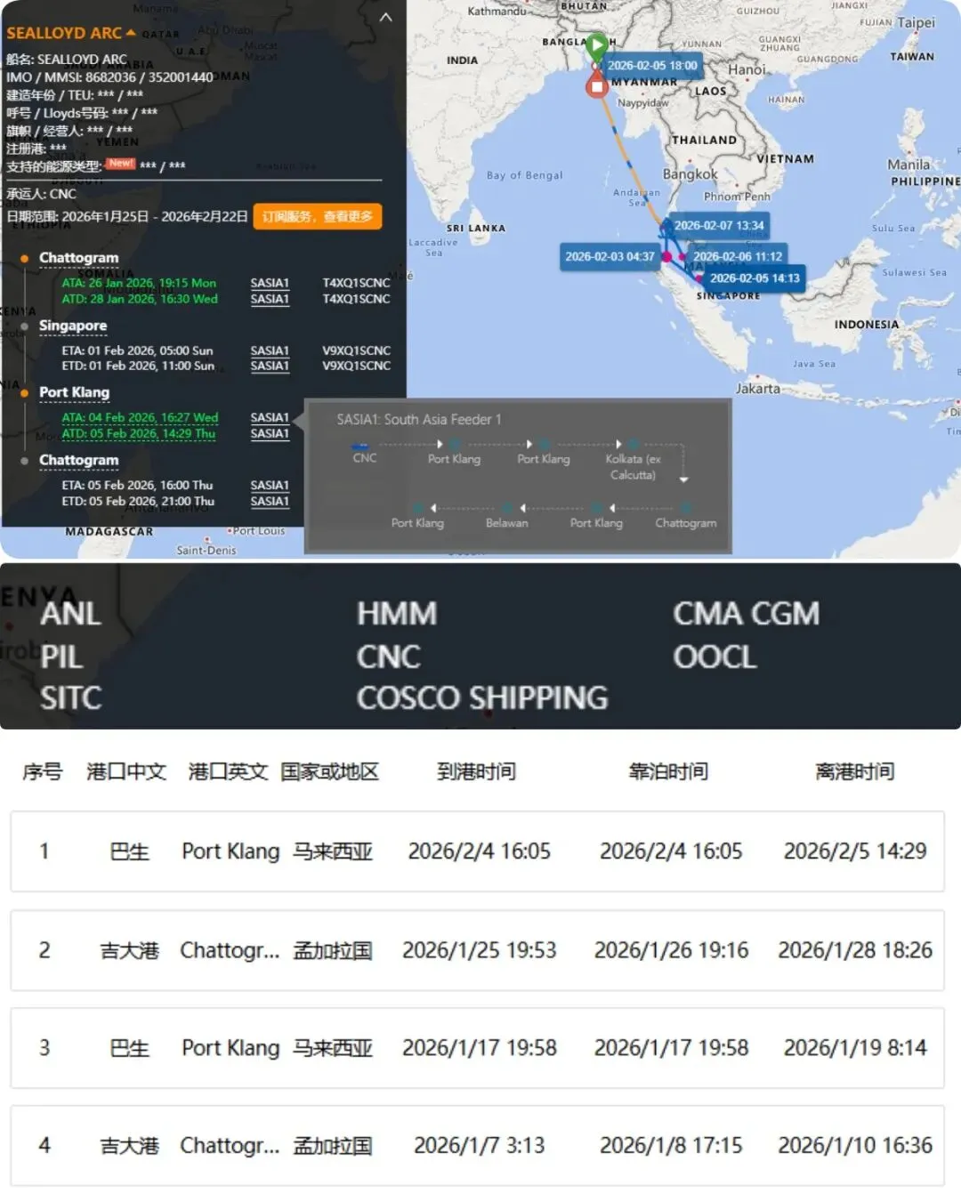 公开资料显示,“SEALLOYD ARC”号集装箱船IMO编号为8682036,建造于2005年,由注册于新加坡的Sea Lloyd Shipping Lines Pte Ltd运营,主要服务于马来西亚巴生港与孟加拉国吉大港之间的南亚支线航线。大船期信息显示,该航线涉及多家船公司共舱,包括ANL、HMM、CMA CGM、PIL、CNC、OOCL、SITC及中远海运等。