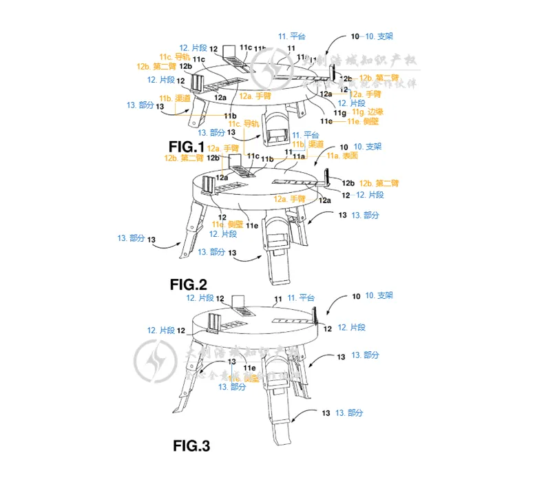 每条支腿的连接方式必须为:第一节腿段铰接在平台底面的一对支架之间;第二节腿段铰接在第一节的一端;第三节腿段铰接在第二节的一端(这实质上是限定了一个具体的三段式折叠铰链结构)。