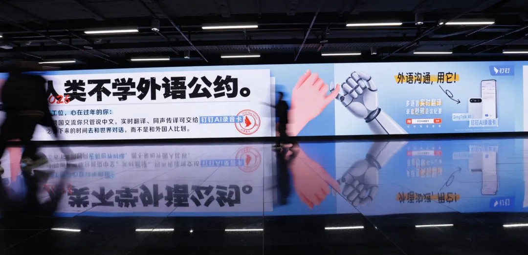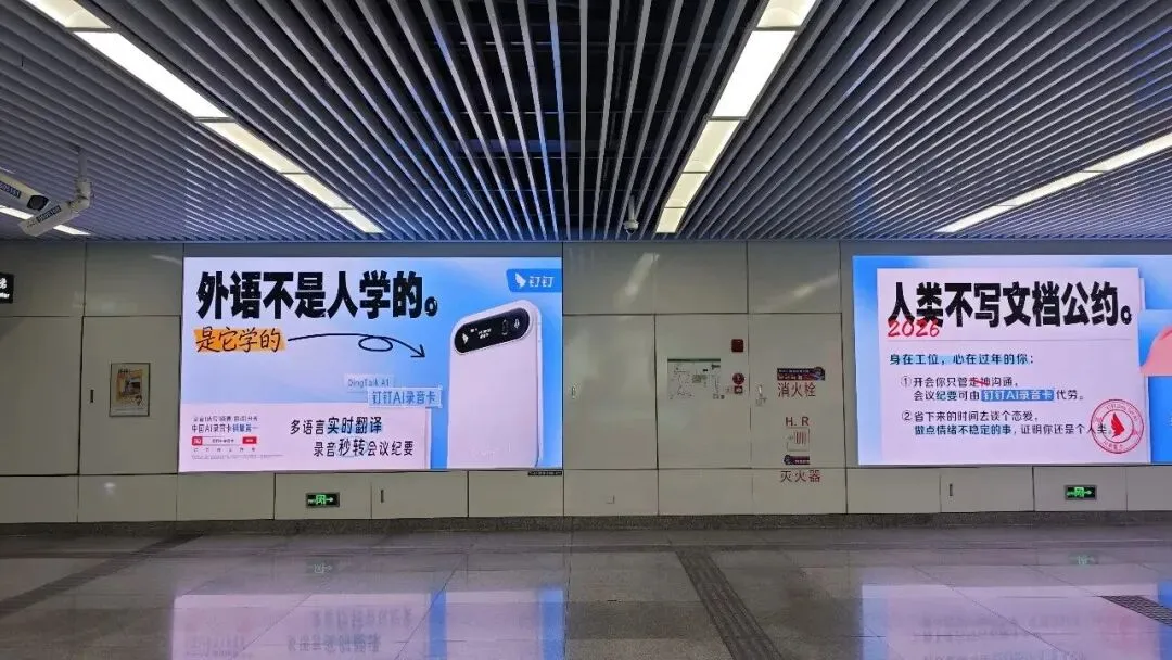 地铁站内,钉钉AI投的那波广告“文案之生猛,形式之大胆”,横幅口号“把记录交给AI,把时间还给人类”,红底白字,几乎打出游行的气势: