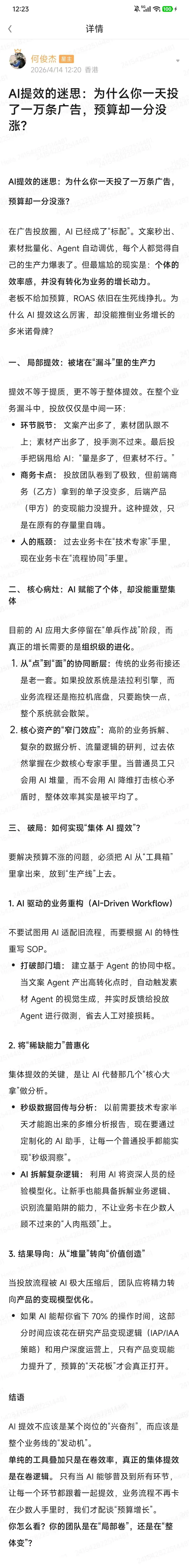 个人提效了,但是集体整体不一定提效,业务之间的衔接还是老的一套,可能你提效了,文案产出更多,素材做不了这么多,或者素材做了这么多,投放的人没能测出(还赖AI的素材不好),不绝对。 你团体效率提升了,商务(乙方)拿到的单子并没有增加。 你的投放能力提升了,但是产品本身的变现并没能提升,你能拿到的预算还一样。