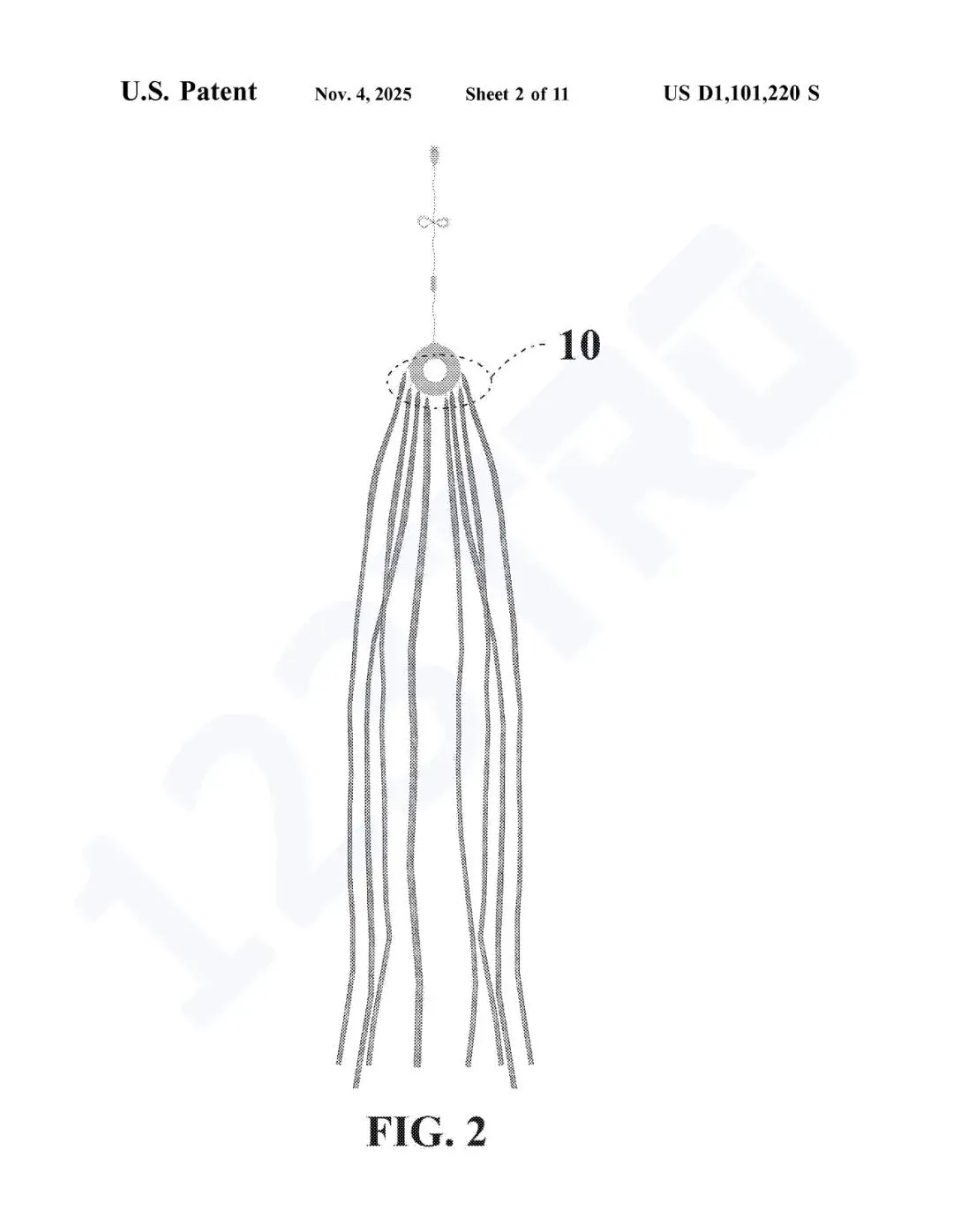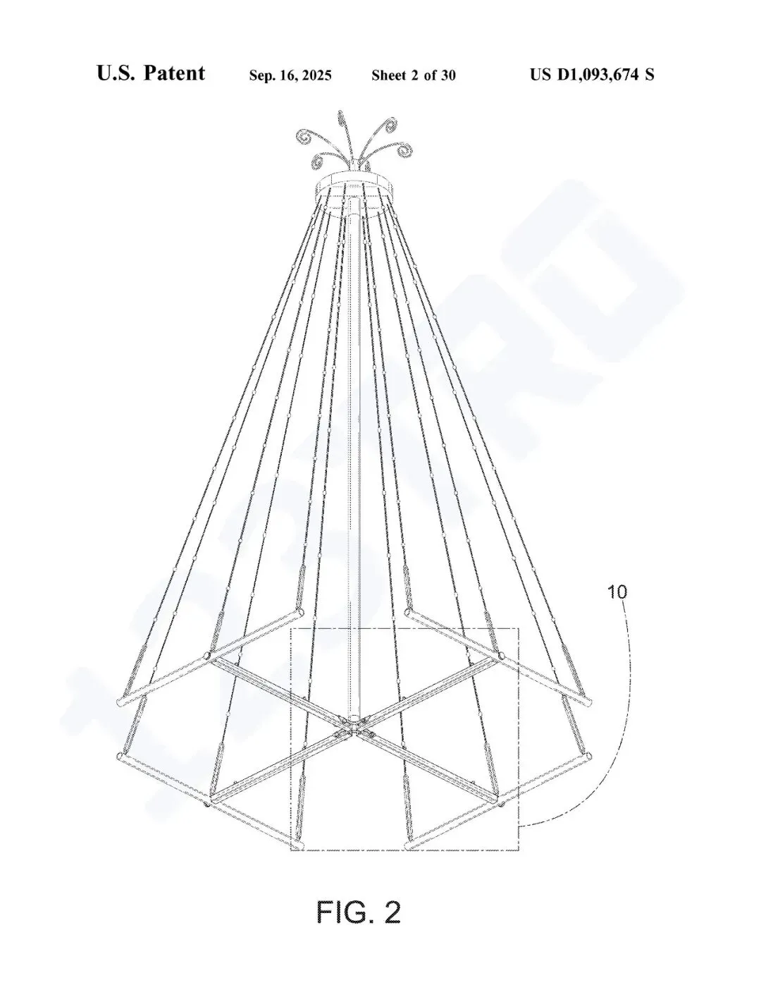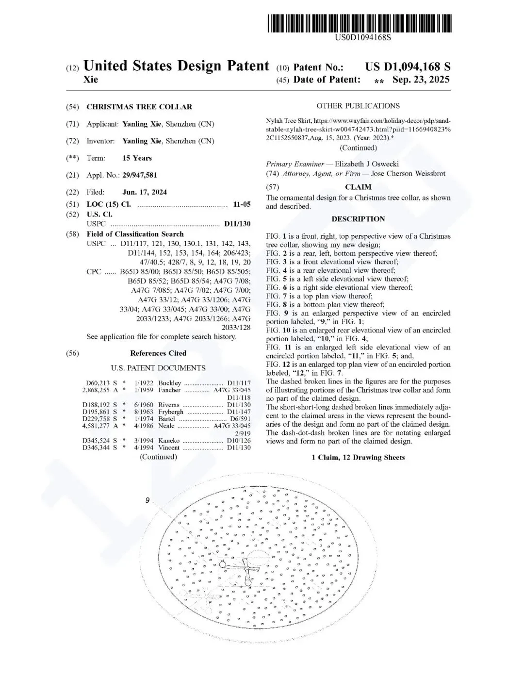 这个专利的外观主要是呈圆形的圣诞树地毯,那一个个圈圈就是blingbling的亮片,再加上衔接处的雪球蝴蝶结