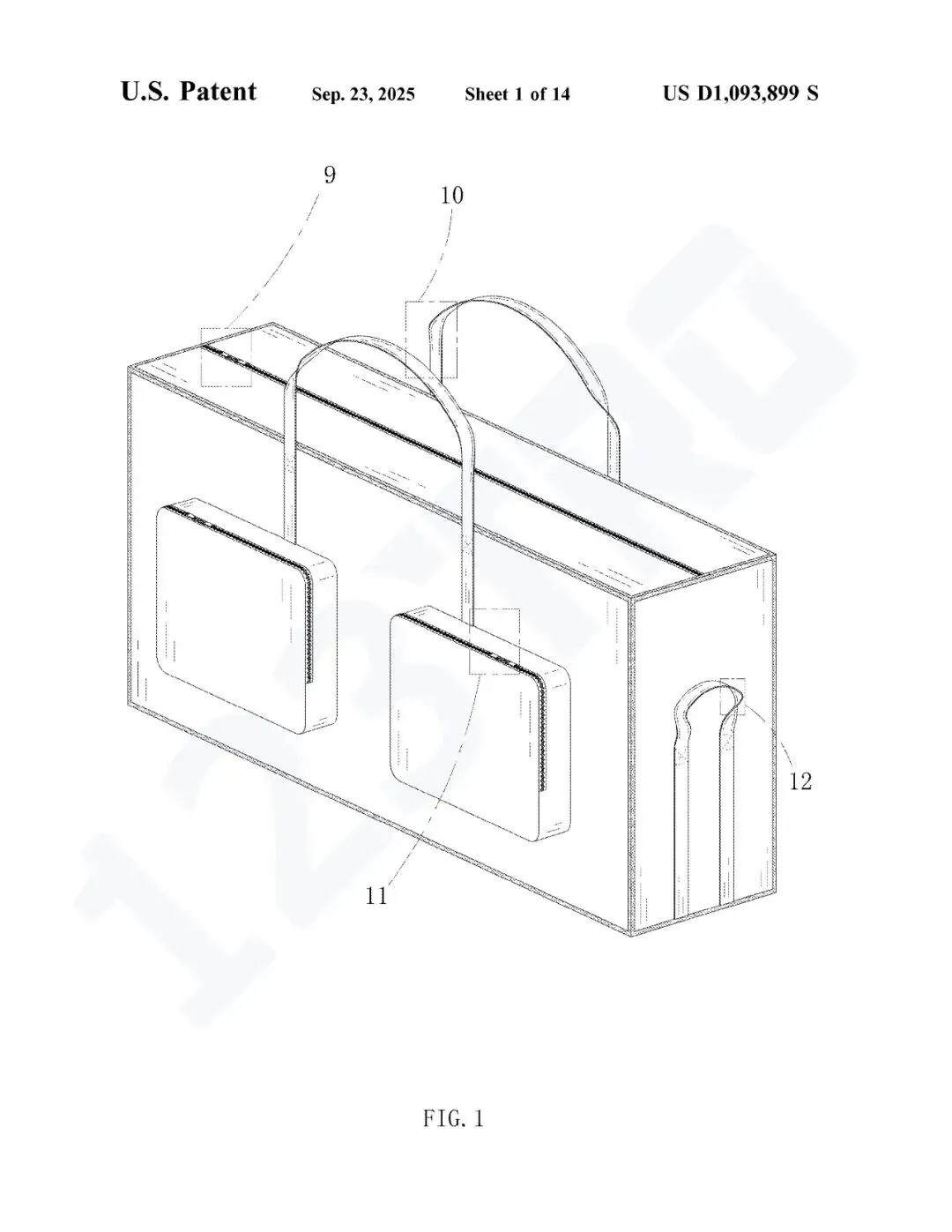 这个专利的外观主要有外置储物袋*2、双向拉链、侧提手*2、主提手明显突出(见图二[10])