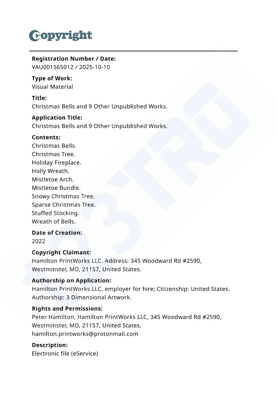 持有人:Hamilton PrintWorks LLC,3D 打印企业