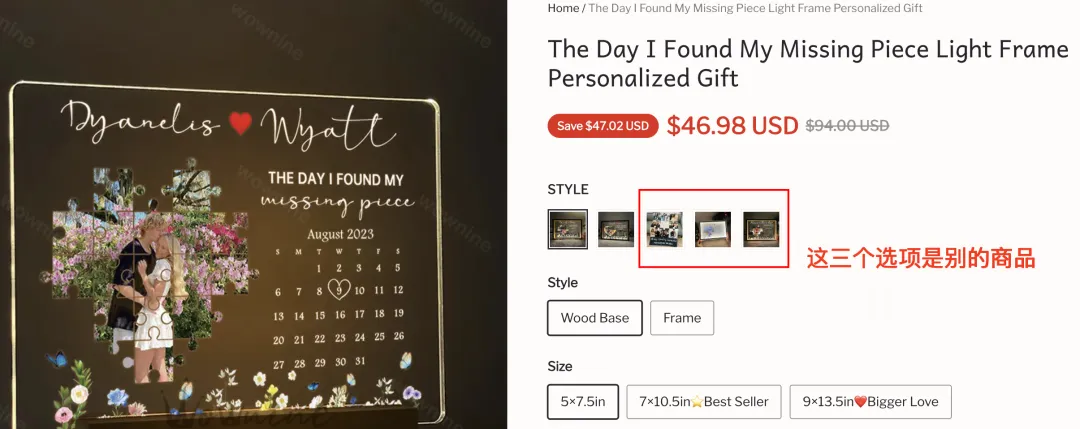 该独立站提供2种样式、3种尺寸供选择,售价在$47-103区间,价差比较大;最贵的$103是9x13.5英寸配木质相框的组合,看样式正是上面感人视频中用来展示的那一款。某宝搜定制发光相框,类似款小尺寸的售价仅¥12。