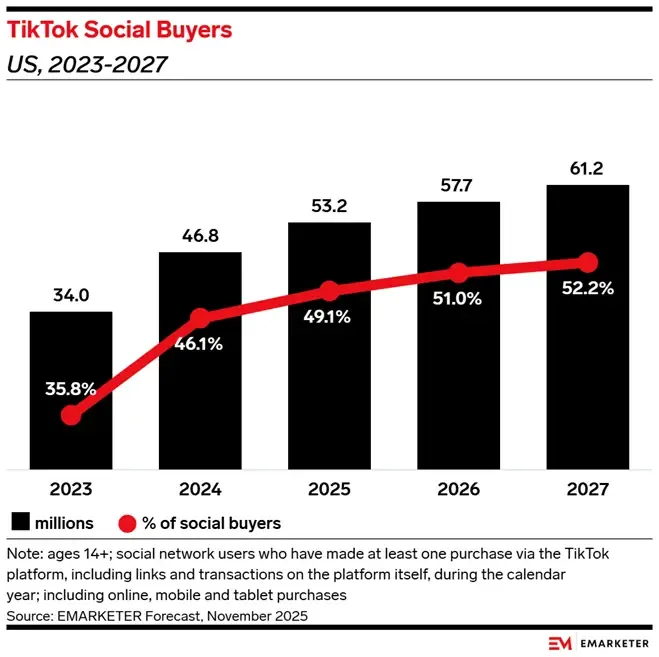 更值得关注的是TikTok 购物人群的增长趋势,数据显示,2025年TikTok买家数量将增长13.6%至5320万人,2026年将达到5770万人,超过美国社交购物人群的50%。换言之,每两个社媒购物者就有一人在TikTok上消费。