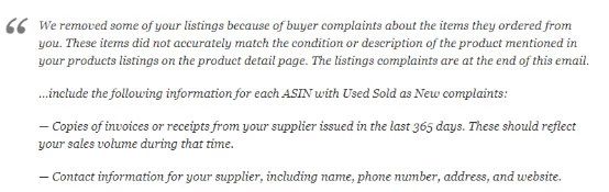 通常亚马逊会向卖家发送如下信息:“由于买家对他们向你订购的产品有异议,这些产品的状态或实际情况与你在listing中的描述不符(产品描述在邮件末尾),我们移除了你的部分产品listing。现在需要你提供过去365天内,产品供应商开出的所有发票副本或收据。此外你还需要提供供应商的联系信息,包括名称、电话号码、地址和网站等。”