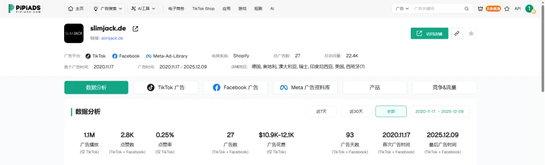 初期,SLIMJACK在Facebook与TikTok上进行了均衡的A/B测试(广告数占比约为52%:48%),体现了专业的渠道探索态度。