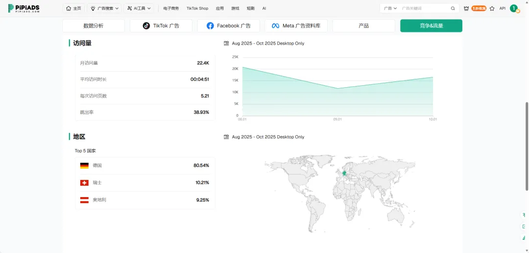 通过Facebook广告访问的用户,平均停留时间长达 4分51秒,人均浏览 5.21个页面,跳出率仅 38.93%。