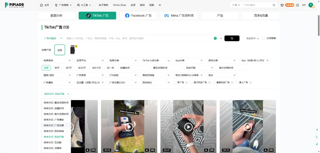 pipiads平台已为该品牌构建完整的广告素材数据库,涵盖从投放到现在的所有在投素材。用户可在TikTok广告分析界面中,按时间、播放量、花费等多维度筛选排序,快速洞察策略演变与竞品结构。