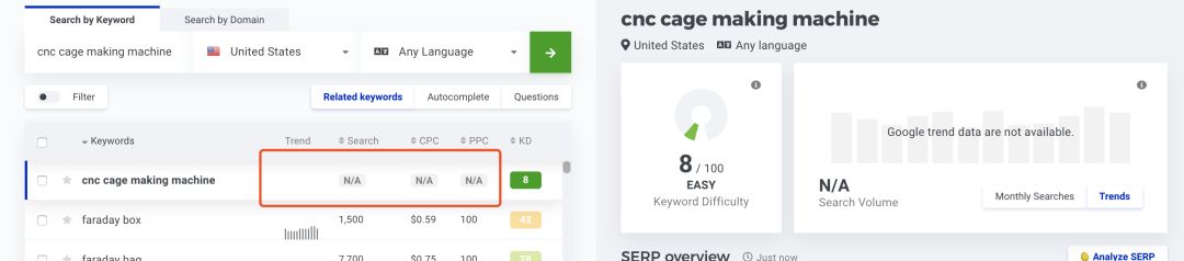 什么是N/A?就是没有搜索量,没有任何流量价值的词,通俗一点就是没有客户会去搜的词。