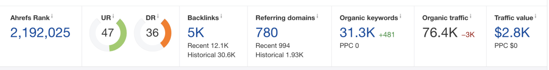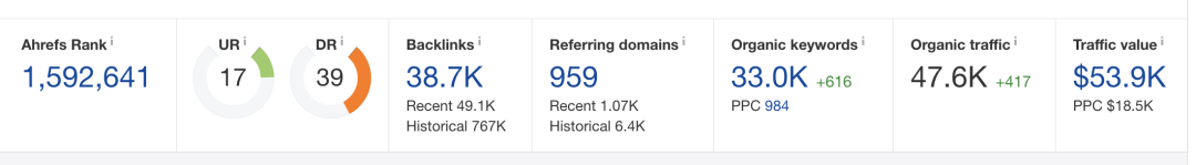 “organic keywords”、“organic traffic”、“traffic value”, 他分别代表自然排名关键词数量,自然搜索流量,流量的价值。