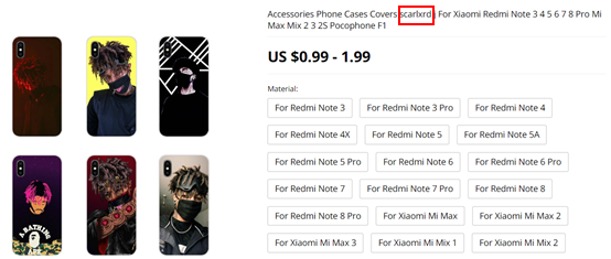 Scarlxrd,原名Marius Listhrop,英国说唱歌手,以其独特的Trap-Metal风格而被听众熟知,也被粉丝称为疤王。在其注册商标中,卖家朋友常常在其产品描述中使用“Scarlxrd”一词,如下面这位卖家,就是因为在产品描述中使用了原告的注册商标而被诉: