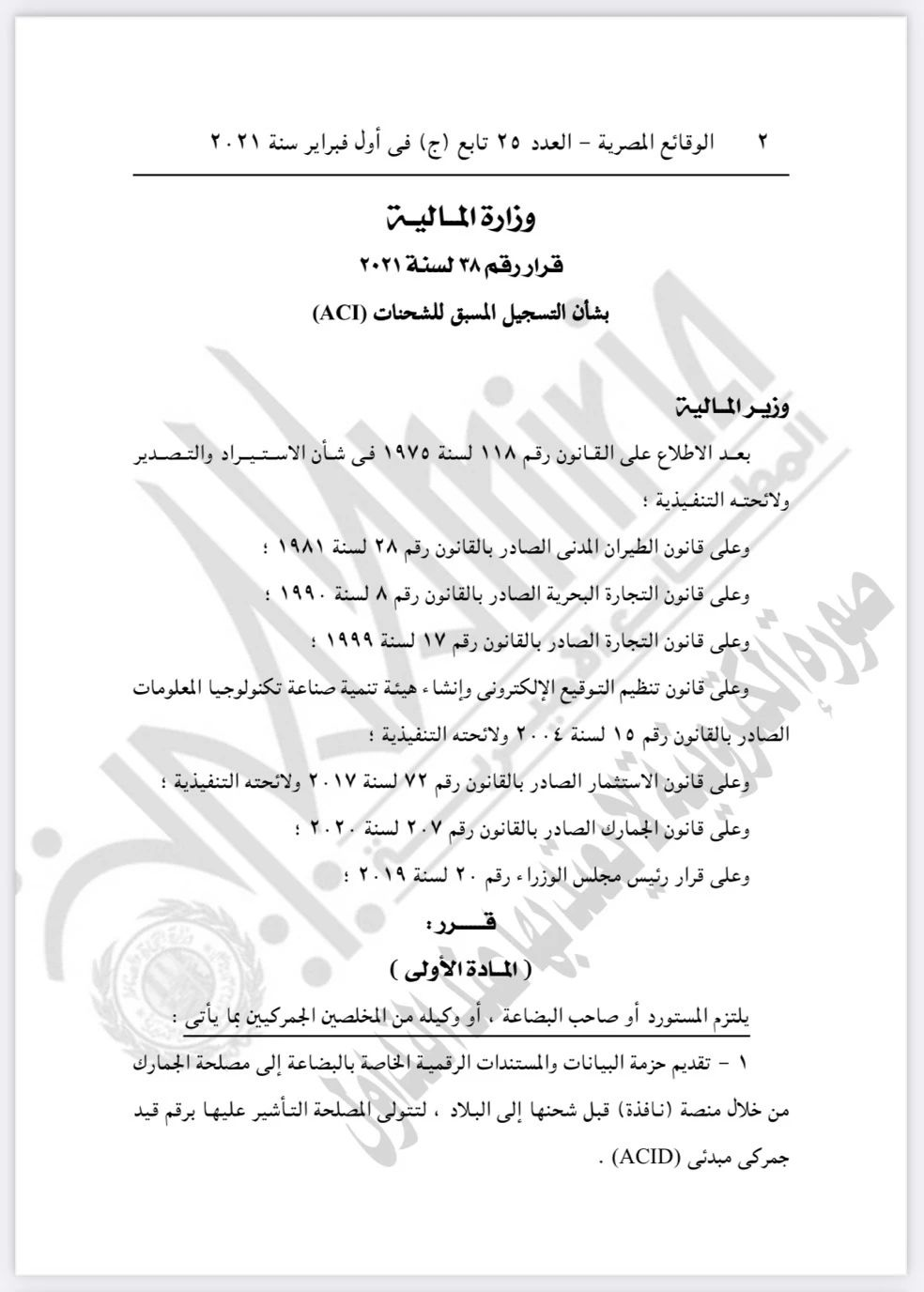 关于埃及2021年第38号财政部长法令