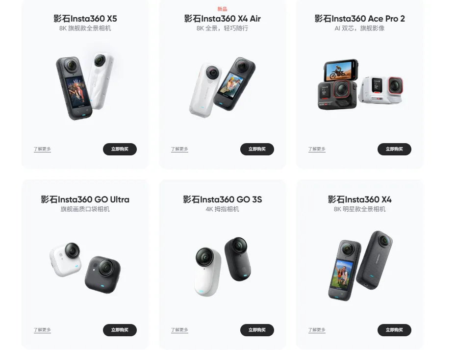 产品包括全景相机、广角相机、手持摄影设备等