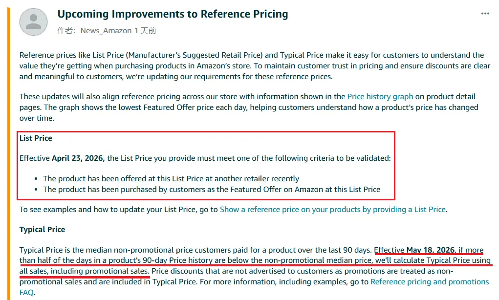 不过,上面这位卖家的“妙招”很快要失效了。就在春促结束的第二天,亚马逊发布了一则关于“商品定价”的新政公告,具体内容如下: