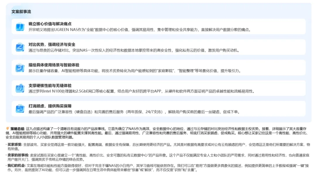 这部分除了有详尽的五点描述拆解,还会告诉你竞品的说服逻辑:是先讲痛点引发焦虑,还是先用参数建立信任?(如下图所示)