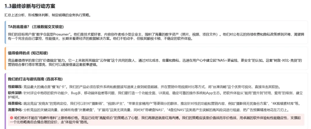 6. 综合洞察:AI结合前面的各项数据与“人货场”模型,总结竞品的打法策略,寻找市场突破口,最后给你一份可落地的行动方案。