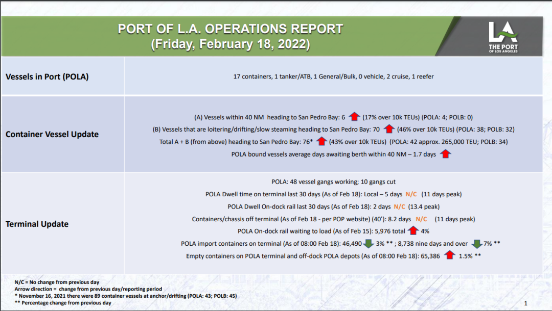 上周五(美国当地时间2022.2.18),在LA/LB码头外等泊的船只一共有76艘,上个星期有几天甚至跌到了70艘以下,不能和疫情前相比,但是对比起春节前动辄一百多艘的糟糕情况来说,这个数字已经是有明显的的进步了。