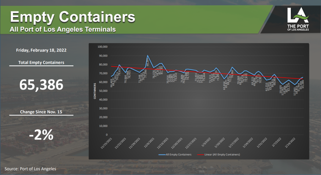 除了进口箱子(import full container),码头里面空箱的数量也在逐步减少。LA 码头的空箱从最高峰的9万TEU降到现在6万多TEU。事实上,LA/LB 码头在过去的2个月集中精力清空箱,船东也积极配合, 前后调了70多条扫空船(empty sweeper)。在码头的空箱少了, 空间可以留给进口的箱子,这样装卸速度就快了,整个码头就可以转起来了。