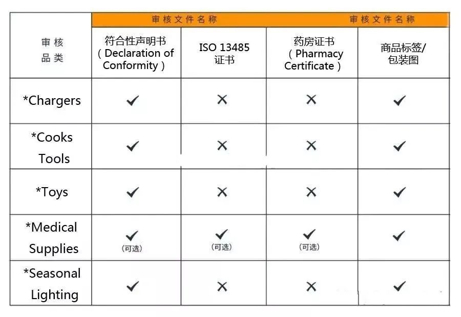 在不同站点,每一个品类审核所需提供的文件资料有可能是不一样的。绝大部分的品类审核需要提供发票、质量管理体系文件,特殊品类的产品需要提交合规性文件如测试证书、符合性声明书、产品图或包装图等。