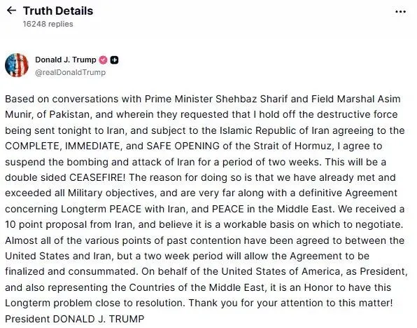 事情发展很快。4月7日傍晚,特朗普在社交媒体发文表示,愿意暂停对伊朗的军事行动两周,前提是霍尔木兹海峡全面、立即开放。