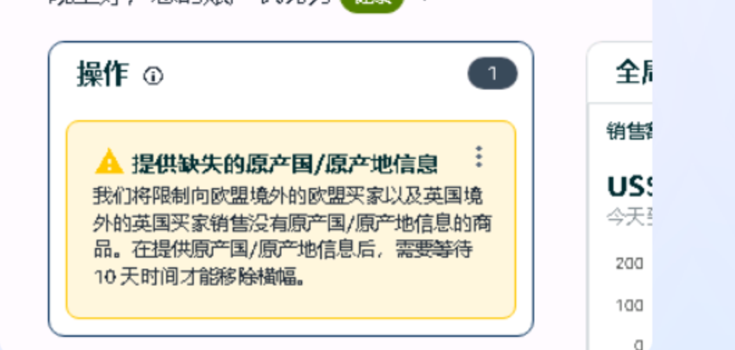 我们将限制向欧盟境外的欧盟买家以及英国境外的英国买家销售没有原产国/原产地信息的商品。在提供原产国;原产地信息后,需要等待10天时间才能移除横幅。