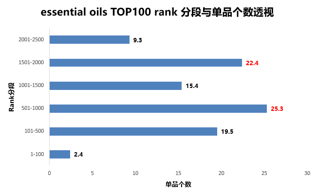 精油类产品在TOP100中 :大类排名超过3000的单品,竟然进不了小类目前100。以500或以更小的rank分段单位作为递进,每个排名分段均有单品分布。无排名段断层,无单品集中分布于某一排名分段。即无销量断崖式下滑,市场业态因市场需求大,卖家多,表现良好。