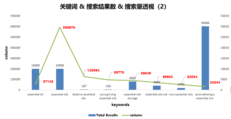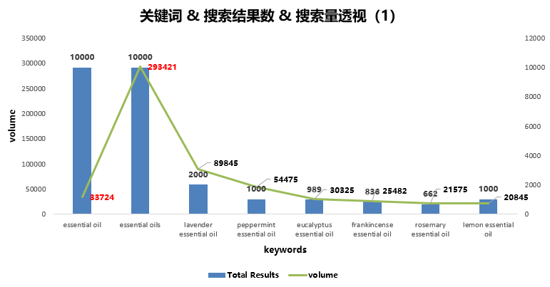 上图中 :essential oils与essential oil的搜索结果数是大致相同,但搜索量复数词远高于单数词和其他长尾词,考虑多个装是买家购买的入口。