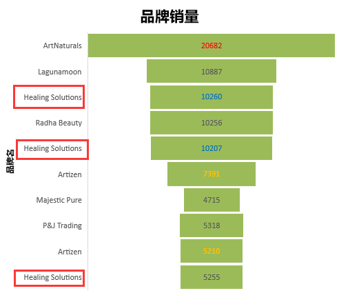 Healing solutions、artizen等高销品牌 :在前期拓词中并未出现在品牌词一类中。doterra、young living等前期拓词中,出现的品牌词对应的单品,则是分布在小类目排名10名以后,且占有率不超过5%。