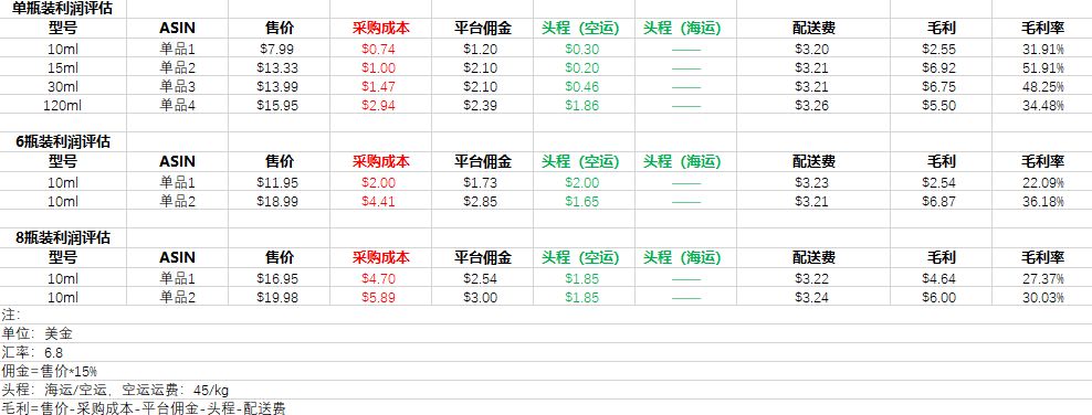 在产品组合类型的选择中 :单瓶装和6瓶装的形式最多。参考个形式市场定价,毛利率产出售卖个数越多,毛利产出并无增长且有下滑趋势,由45%-25%大致范围浮动。多个装均以5ml、10ml作为单元进行售卖,单个装15ml,30ml利润产出则较高。