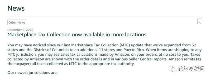 近日,亚马逊美国站发布了一则有关在更多地区商城征税(Marketplace Tax Collection)的公告,新增了11个需要由亚马逊代收代缴销售税的地区。