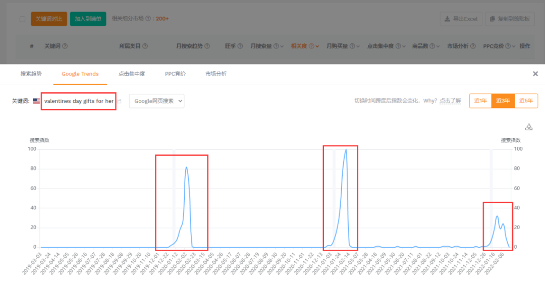 老外比较懂浪漫,所以过情人节的时候还是很有仪式感的,那么在节日之前的礼物类产品就会很畅销。我们通过“卖家精灵”嵌入的Google Trends功能(无需翻墙)可以看到,情人节之前的关键词搜索都会直线攀升。