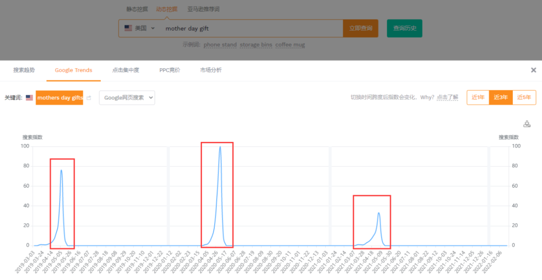 同样,我们直接搜关键词 mothers day gifts,在Google Trends中也能看到关键词搜索直线上升的趋势。