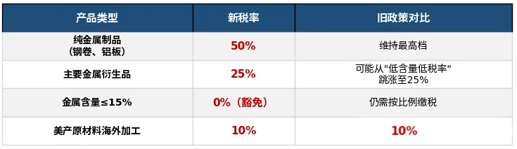 依旧按 50% 征收,但计税基数从金属部分改为商品全部申报价值,彻底封堵之前低金属含量的避税漏洞