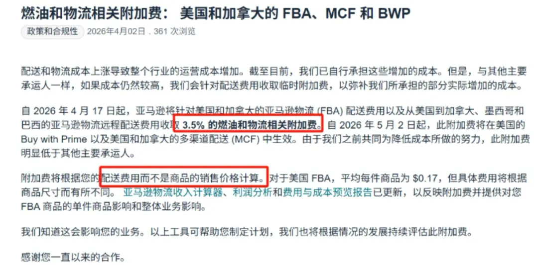 4月17日起:FBA配送费临时上调3.5%燃油和物流附加费。美国发往加拿大、墨西哥、巴西的FBA远程配送费同样适用