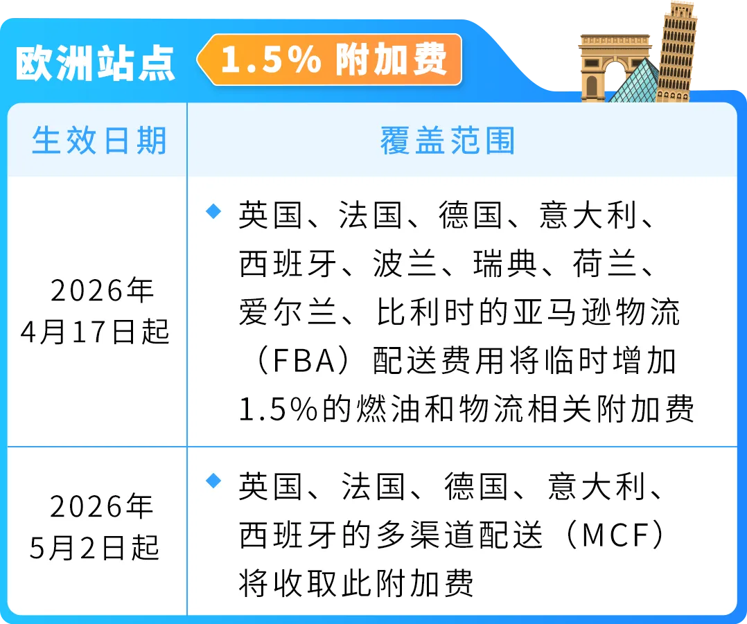 4月17日起:对英、法、德、意、西、波、瑞、荷、爱、比等10个国家的FBA配送费临时上调1.5%。