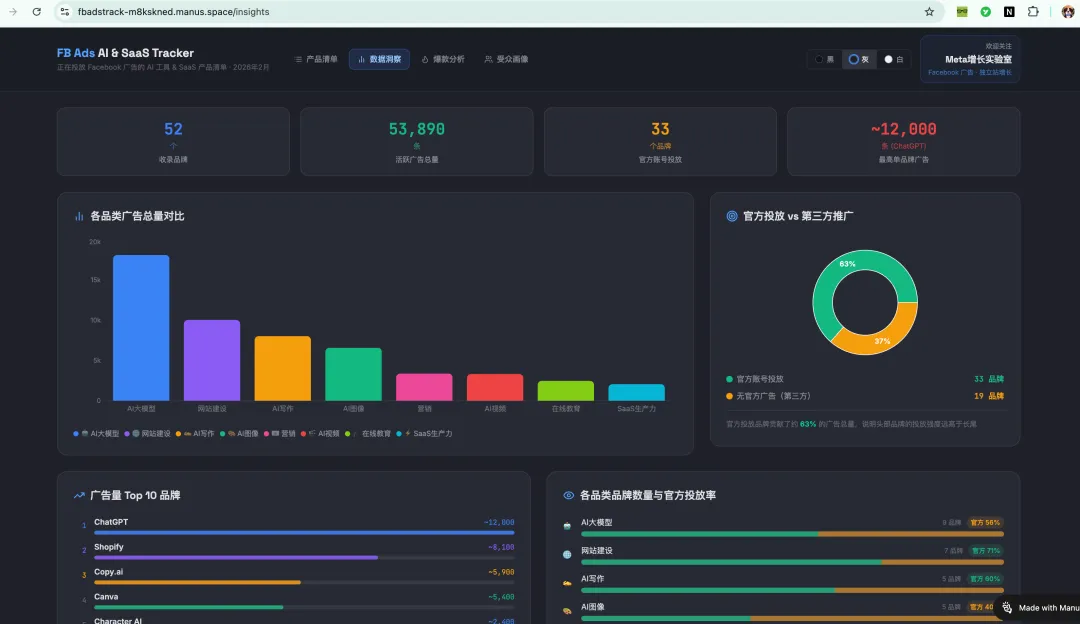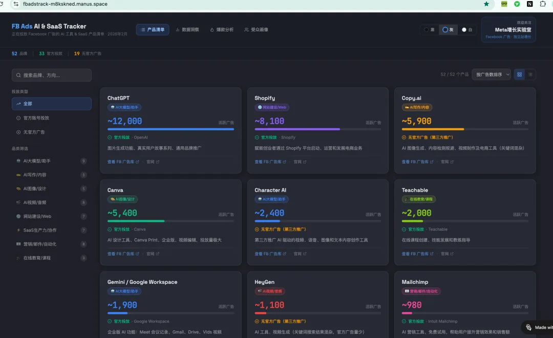 我做了7年Facebook广告,我从来没见过一个赛道能在这么短的时间内集中爆发这么多广告。ChatGPT一家就跑着12,000条活跃广告,持续投放595天。Claude在2026年2月集中上线KOL合作内容,打法跟ChatGPT完全不同。Kling AI作为中国出海品牌正在加速投放AI视频广告。Mailchimp、Klaviyo、HubSpot三巨头同时在广告里猛推"AI功能升级"。而Midjourney、DeepSeek这些热门产品,官方一条广告都没投,但第三方推广的广告数却高达几百条。过去两周,我通过Meta Ad Library对150多个AI工具和SaaS产品进行了系统性搜索,最终筛选出活跃广告数超过60条的AI产品共43个,涵盖6大品类,活跃广告总量约43,369条。这篇文章要回答三个问题:哪些AI产品在投Facebook广告,投了多少?它们的投放策略有什么共性和差异?作为FB广告从业者,我们能从中学到什么?在拆解具体品类之前,先从四个维度鸟瞰整个AI工具的Facebook广告格局。几个值得注意的规律。AI大模型一个品类就占了全部广告量的43%,但官方投放率却是所有品类中最低的,只有55%。这意味着大模型品类有接近一半的广告来自第三方推广——KOL、课程卖家、代理商在借这些品牌的流量做自己的生意。营销/自动化品类走向了另一个极端,官方投放率高达89%,9个品牌中8个是官方直接投放。原因很直接:这类产品的目标用户本身就是营销人员,他们在Facebook上高度活跃,用Facebook广告触达他们是最短路径。AI视频/音频是2025年下半年才集中爆发的品类,虽然目前广告总量排名靠后,但增长势头最猛,多个品牌同时开始规模化投放。2.2 AI产品分类维度:AI原生 vs AI增强型AI原生产品——产品核心功能就是AI,没有AI就不存在这个产品。比如ChatGPT、Midjourney、HeyGen、ElevenLabs、Perplexity、Kling AI。这类产品共24个,贡献了约29,675条广告,占总量的68%。AI增强型产品——本身是成熟的SaaS产品,在原有功能基础上叠加了AI能力。比如Canva加了Magic Design、Mailchimp加了AI营销代理、Asana加了AI工作流自动化、Notion加了AI笔记助手。这类产品共19个,贡献了约13,694条广告,占总量的32%。这个分类揭示了一个有意思的现象:AI原生产品贡献了68%的广告量,是Facebook广告投放的绝对主力。但如果看官方投放率,AI增强型产品反而更高。原因在于,AI原生产品中有大量第三方自发推广(Midjourney、DeepSeek、Character AI等),品牌不花钱也有人帮忙打广告。而AI增强型产品缺少这种自然话题性,更依赖品牌自己掏钱买量。两类产品的广告叙事也完全不同。AI原生产品卖的是"新能力"——"你以前做不到,现在用AI可以做到了"。AI增强型产品卖的是"效率升级"——"你以前要花2小时,现在用AI只要5分钟"。如果你将来帮这两类产品投广告,素材的切入角度是完全不一样的。按广告量级来看,43个品牌呈现极其明显的头部集中效应:数据来源:manus.aihttps://fbadstrack-m8kskned.manus.space/insightsT1超级投手(5,000条以上):只有3个品牌——ChatGPT约12,000条、Copy.ai约5,900条、Canva约5,400条。仅这3个品牌就占了总广告量的54%。但需要注意,Copy.ai的5,900条广告大多来自第三方借关键词推广其他AI工具,实际官方广告量很少,这是数据中最大的"虚火"。T2重度投手(1,000-5,000条):5个品牌——Character AI约2,400条、Gemini约1,900条、Asana约1,800条、HubSpot约1,200条、HeyGen约1,100条。这个梯队的品牌都有明确的付费获客策略,广告持续时间长、素材更新频繁。T3中度投手(300-1,000条):16个品牌,包括Mailchimp、Captions AI、ElevenLabs、Perplexity、Klaviyo、Midjourney等。这个梯队是"中坚力量",品牌数量最多但单个品牌的投放规模相对可控。T4轻度投手(60-300条):19个品牌,包括Kling AI、Claude、Manus AI、Runway ML、ManyChat等。这些品牌要么刚开始试水Facebook广告,要么投放策略偏保守,广告量不大但值得持续观察——特别是Claude和Kling AI,近期都在加速投放。一个直观的对比:ChatGPT一家的广告量(12,000条)比T3和T4全部35个品牌加起来还多。这就是AI广告赛道的头部集中度。广告量只是一个维度,持续投放天数才是判断广告ROI最直接的指标。没有正向回报,没人会持续投半年以上。ChatGPT持续595天,是整个榜单中投放时间最长的。Canva持续317天,Asana持续316天,Mailchimp持续287天,Teachable持续268天,ElevenLabs持续251天,Grammarly持续235天,Notion AI持续217天,Webflow持续213天,HeyGen持续196天,Captions AI持续182天,Airtable持续175天,Klaviyo持续168天,Perplexity AI持续105天,HubSpot持续98天。这些数据说明:这些品牌的Facebook广告是"赚钱的"。持续投放数百天意味着每天都在产生正向ROI,否则早就停了。如果你想研究AI产品怎么做Facebook广告,这16个品牌的广告资料库是最值得翻的。近7天加速投放的品牌有7个,代表了最新的市场动向:Claude新增8条广告,集中上线KOL合作内容;Asana和HubSpot各新增5条,持续加码AI功能方向;Teachable新增4条,Perplexity AI、Kling AI和Manus AI各新增3条。其中最值得关注的是Claude和Kling AI。Claude是Anthropic第一次大规模在Facebook上做付费推广,采用了与ChatGPT完全不同的KOL合作路线。Kling AI是快手旗下的AI视频生成工具,正在加速海外投放,是中国AI出海的一个缩影。这是本次调研中最有意思的发现之一,也是中文内容圈几乎没人分析过的维度。43个AI品牌中,31个有官方账号直接投放,占72%;12个仅有第三方推广、官方账号不投放任何广告,占28%。所谓"官方投放",是指品牌方用自己的Facebook主页直接投放广告,广告内容由品牌方控制,素材策略系