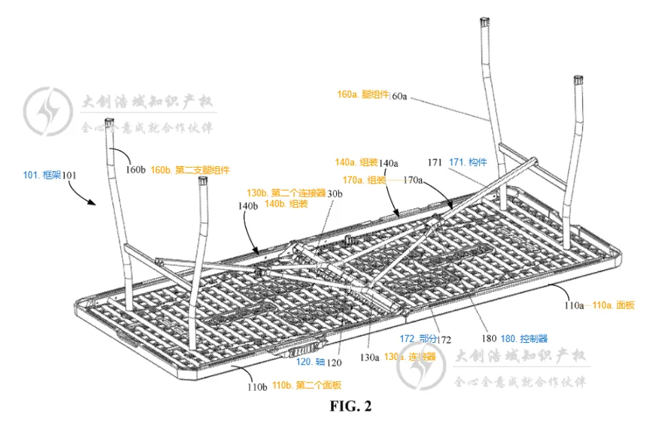 (ii)当桌子完全打开时,这个支撑块会同时向上顶住第一块和第二块桌板,像两个稳固的支点,帮助两块桌板保持平整,让桌面更稳固。