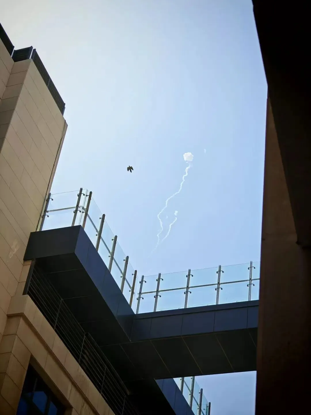焦虑也在中东华人出海社群中急速扩散:有人登上从上海飞往利雅得的航班,落地后却无法下机,只得被迫返航,历经近三十小时的空中飞行,最终回到原地;外贸、物流与跨境电商从业者焦头烂额,直面航运受阻、货物交付停滞带来的一系列难题与直接损失;身处中东的出海人,大多选择闭门不出、居家避险,偶尔在阳台拍下头顶呼啸而过的战机,以及导弹被拦截后坠落的残骸。可即便是足不出户,也难以获得绝对安全,猝然坠落的无人机竟会径直砸向民居,将屋内撞得七零八落。