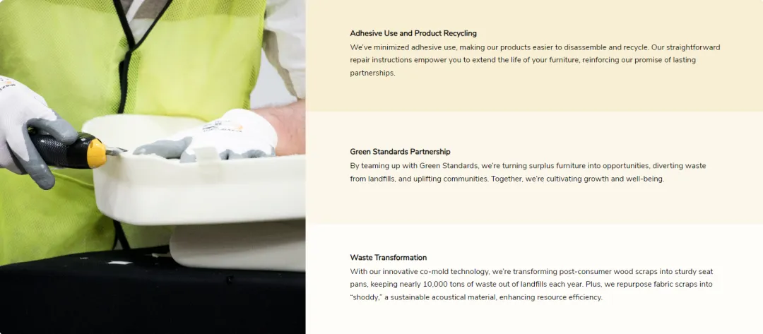 HON在官网系统性展示了从生产流程、材料选择到包装与产品性能的可持续实践,包括库存家具社区再利用、减少垃圾填埋、使用可回收材料替代泡沫包装等。