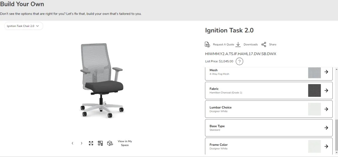 HON允许客户在单品层面选择尺寸、网布、面料、腰托、框架颜色等配置,并同步生成型号与报价,支持下载、分享与询价。这样一来,客户在前期就能完成外观、功能和预算的组合判断,而不是依赖销售反复沟通。同时,这也向采购方传递了一个信号——品牌具备成熟的模块化设计与交付体系,而不是临时拼凑方案的供应商。