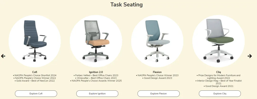 在高金额、长期使用的采购中,仅凭官网描述很难判断产品的真实水平。为增强信任,HON将来自NAOPA、Good Design Award、NeoCon等机构的奖项集中展示,并覆盖多个产品线,形成系统化的荣誉矩阵。
