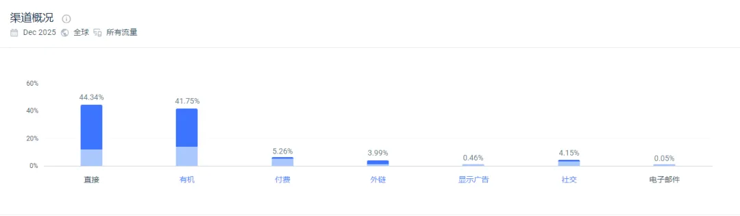 根据similarweb数据显示,HON官网的流量主要来自于直接访问流量(44.34%)、自然搜索流量(41.75%)、付费广告(5.26%)、社交媒体(4.15%)。这说明其获客重心并非制造大量陌生流量,而是覆盖已经形成需求、正在评估供应商的群体。