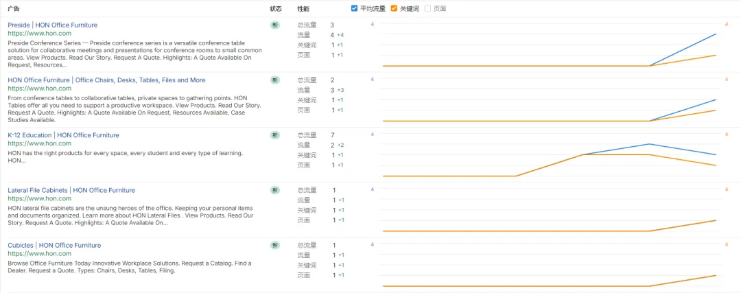 此外,从关键词和流量规模,我们可以看出,HON的广告更偏向于防御型与精准覆盖型投放,主要针对品牌词、产品线词和垂直场景词进行补充投放。这一方面可以防止竞争对手抢占品牌词或核心品类词的广告位,另一方面可以确保高意向客户优先进入HON体系。
