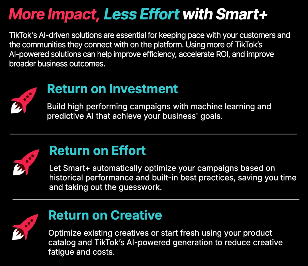 在投放层面,TikTok 持续强化以 Smart+为核心的 AI 广告解决方案,将受众、出价、版位、优化策略等整合进统一的智能系统。广告主只需设定核心目标与预算,其余决策都可以由算法完成。