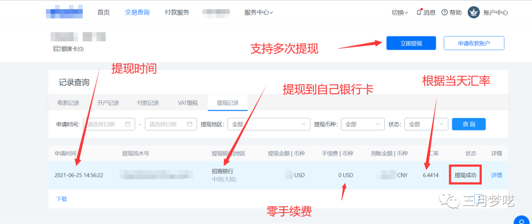 然后办理这个美国卡是免费的,直接手机号/身份证就可以提现了